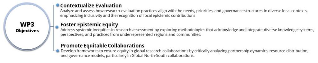 By integrating these components, WP3 aims to provide actionable insights and tools to democratize research evaluation and enhance global equity in knowledge production. The outcomes will feed into broader frameworks for federated infrastructures, contributing to the project’s overarching goal of opening research assessments to multicontextual considerations.