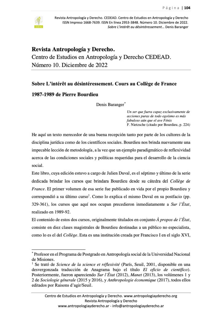 Reseña de Denis Baranger sobre el libro “Sobre L’intérêt au désintéressement. Cours au Collège de France 1987-1989 de Pierre Bourdieu”, coordinado por J. Duval.